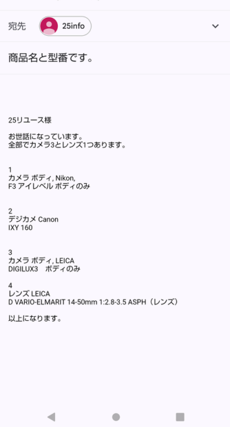 申込を完了すると、後日担当者から、商品名と型番を送ってくださいという返信がありました。