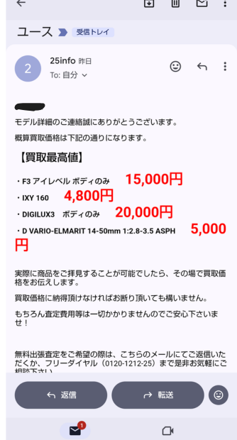 一番高い金額を付けてくれたのはカメライオンでした。ニーゴ・リユースより2万円高い金額を出してくれました。