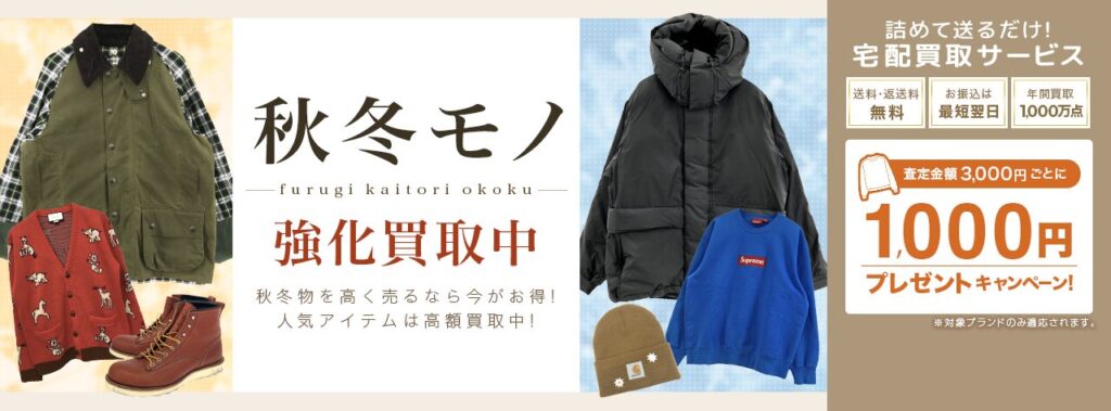 買取王国はストリート系・アウトドア系・スニーカーに特化しており経験豊富な査定士が、あなたの大切な服を丁寧に評価してくれます!無料査定・配送料無料・キャンセル時の返送料も無料なので一度宅配査定を利用してみよう。