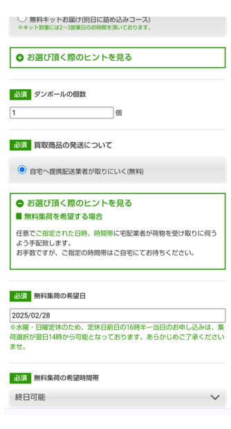 ①まずは段ボールの有無を選択します。ない場合は無償で提供してくれます。②次に集荷日時の設定をしましょう。家まで配送業者が来てくれます。料金は一切かからないのでご安心ください。