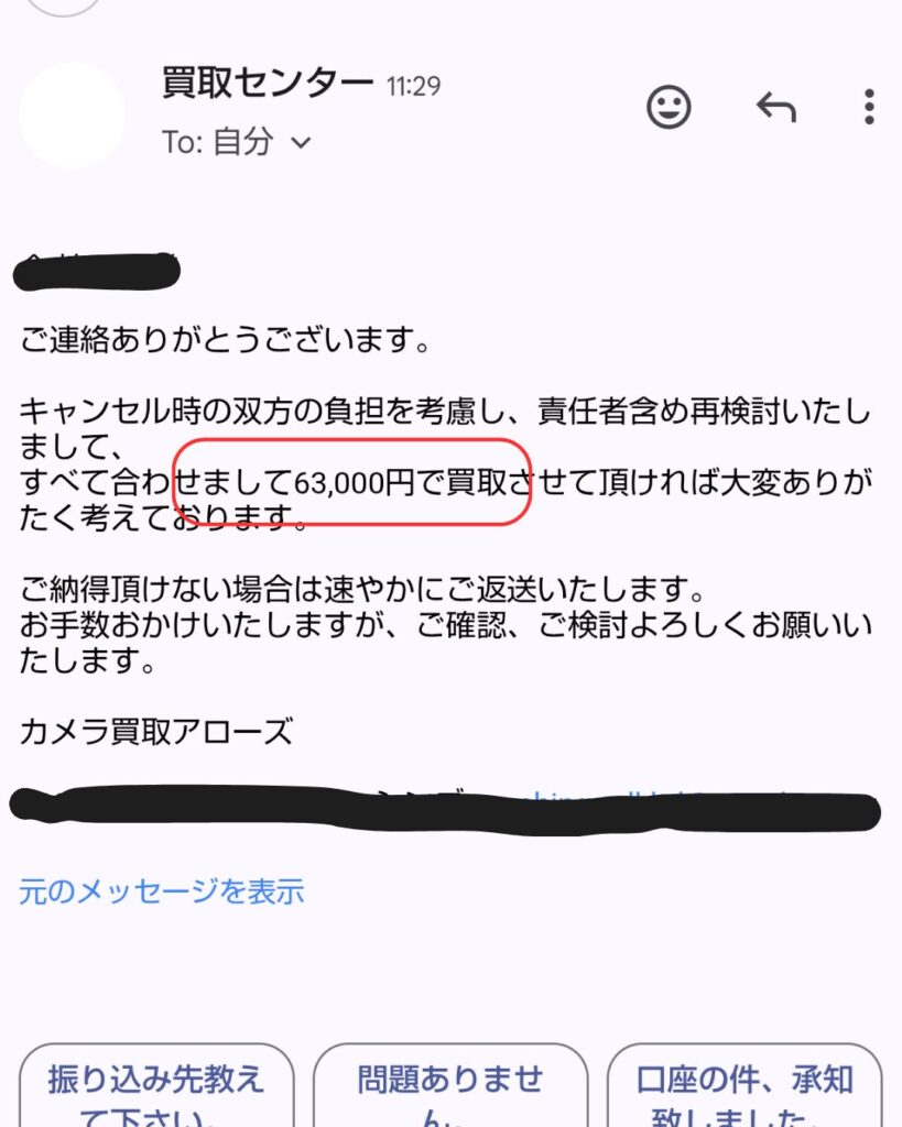 3体合計で63,000円の提示金額を出してくれました。買取相場は約35,000円前後ですので、カメラ買取アローズは相場より高い金額を出してくれました。