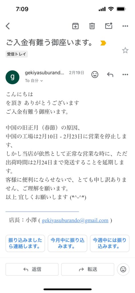 入金後に指定されたアドレスに自分の名前と入金金額をいれてメールをしないといけないらしい。