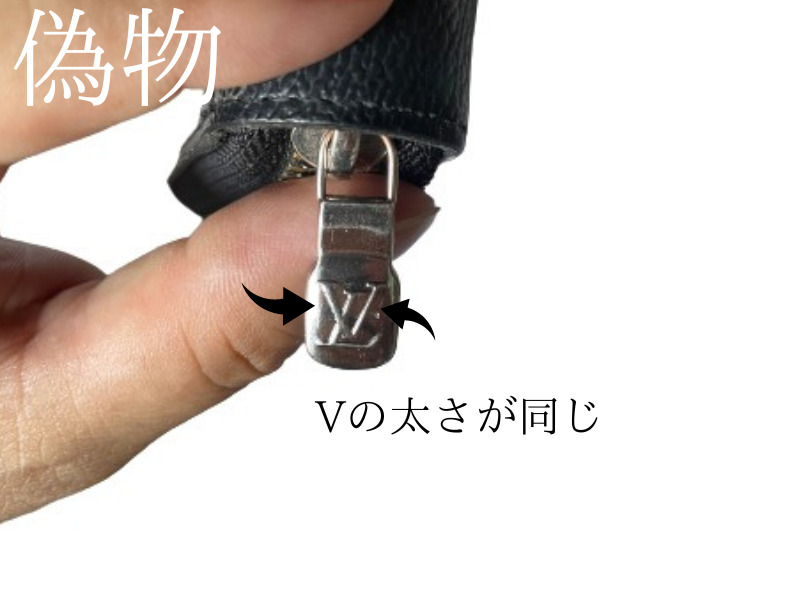 本物はパッとみただけで「V」の太さがあきらかに違います。偽物は「V」の太さが同じもしくは微妙に太さが違ったりします。基準はパッとみた「V」太さです。