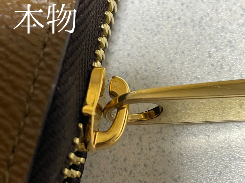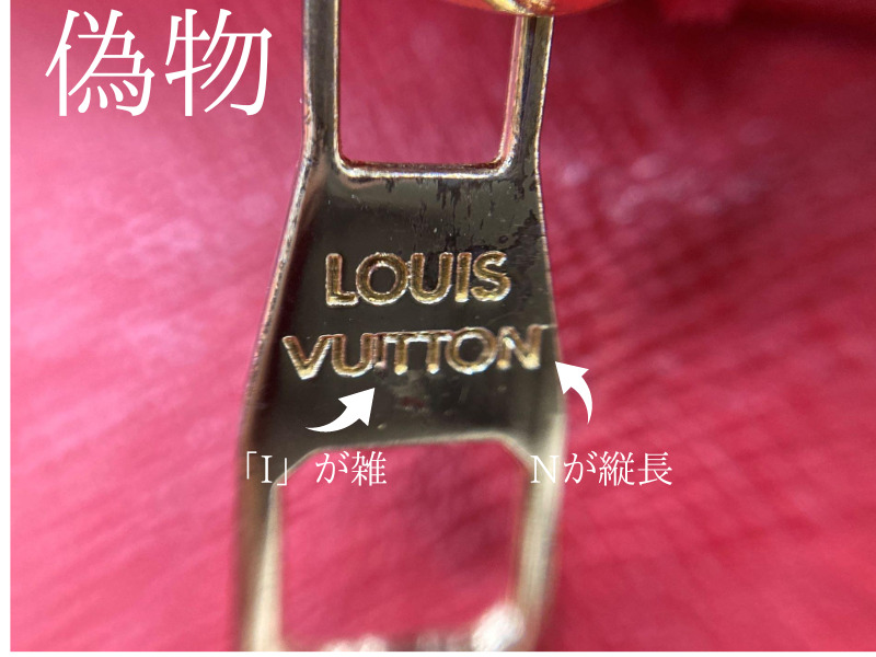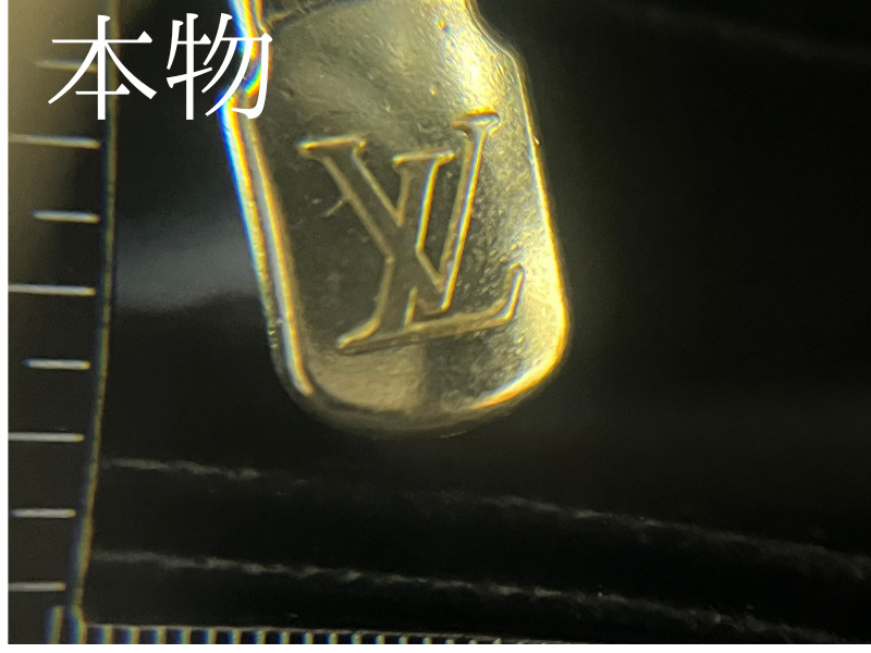 最近、見かける偽物のは謎の刻印があります。一度ファスナー横の刻印を確認してみてください。もしこのような謎の刻印があれば一発アウトです。たまに「YKK」の刻印が入ってる刻印もありますが、ルイヴィトンには「YKK]は使われていません。「YKK」の刻印があったら偽物です。