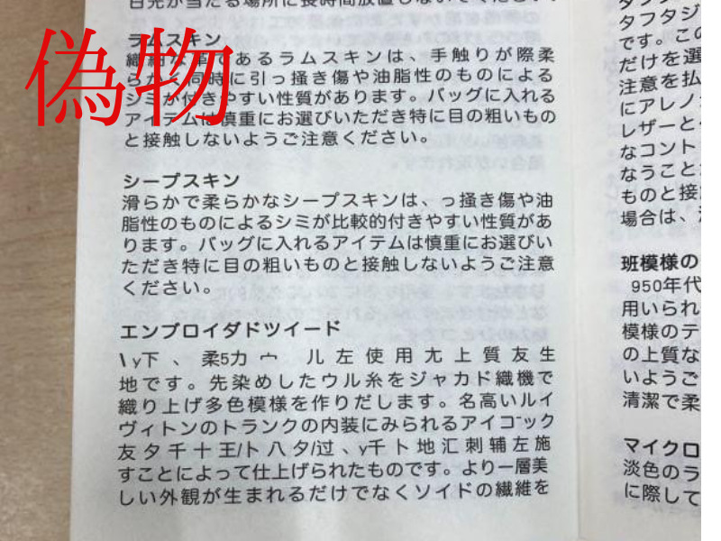 偽物の付属品の特徴はあきらかに日本がおかしかったりします。ルイヴィトンだけじゃなくすべてのブランドにも言える事です。一度付属品の説明書を確認しおかしい日本語あるか確かめてはいかがでしょうか?※本物の箱を使って偽物の財布を入れてる場合もあります。
