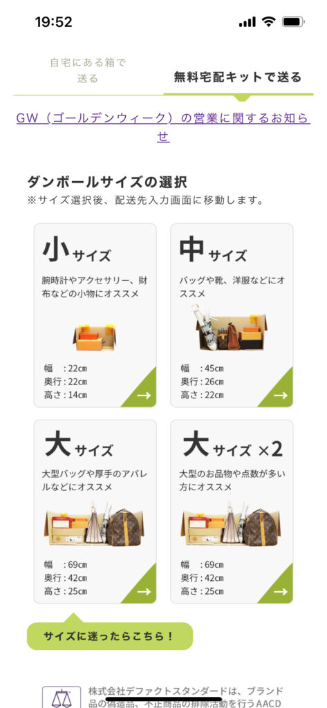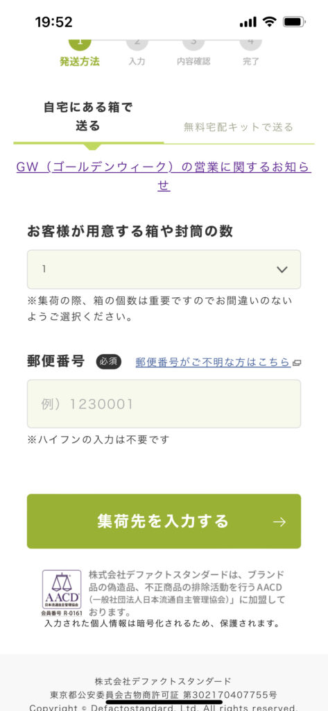 自分で箱を準備するか?無料で段ボール送ってもらうか?選べるようです。今回は自分で用意しました。