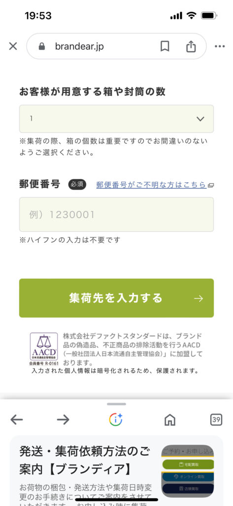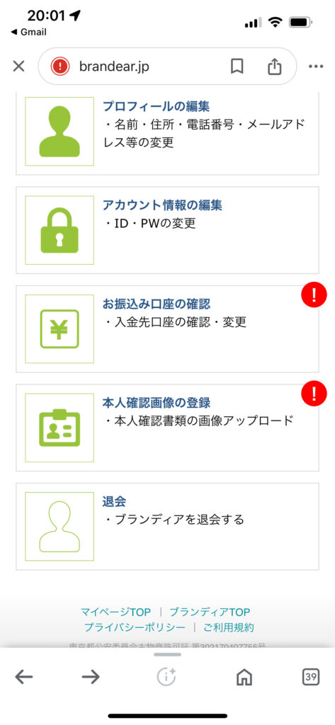 送られてきパスワードでブランディアのマイページへログインしてみました。ご本人確認のと振込先の登録も事前必要です。これですべての登録が終わりました。あとは集荷を待つのみです。