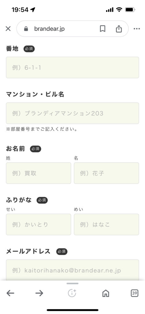 「集荷先」をタップすると個人情報を入力する画面に代わり、入力を済ませました。
