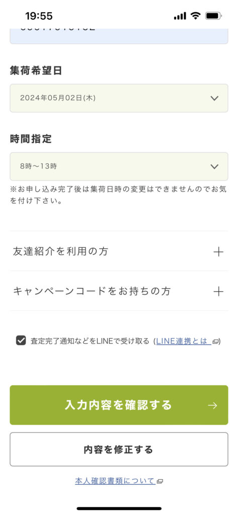 集荷する日時を決め終わりました。