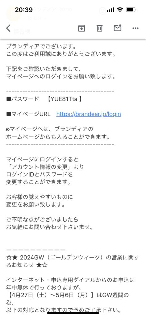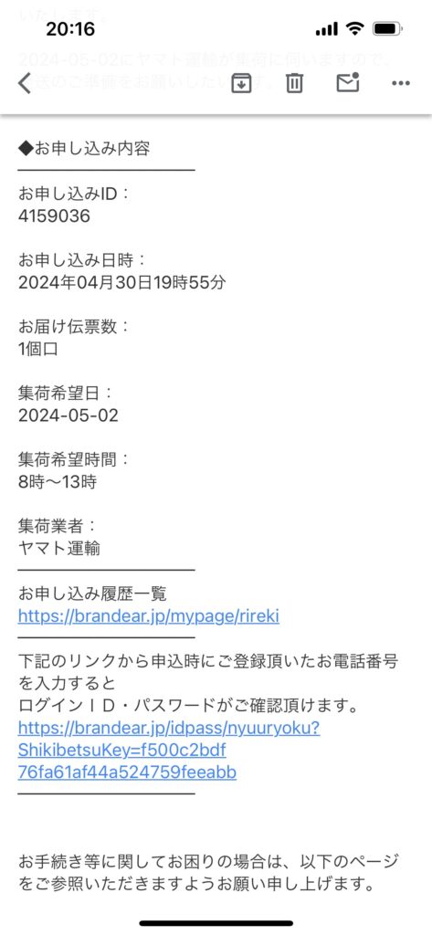 LINE登録を終えると、「パスワード」と「集荷手配完了」のメールが2通送られてきました。どうやらブランディアの会員に強制的にならないといけないらしい。