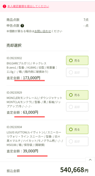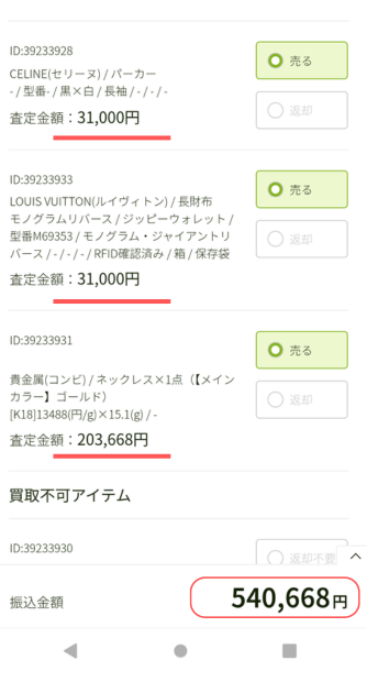 ブランディアの査定金額は全部で540,668円でした。結構な金額でビックリしました。