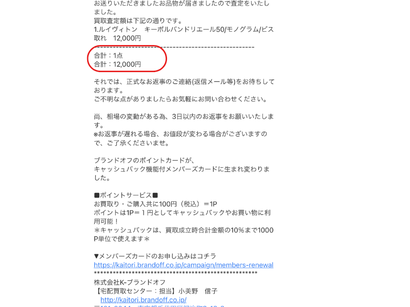 こちらのヴィトンのバッグ買取相場12,000円~15,000円に対して、ブランドオフは12,000円の査定金額になりました。ブランドオフは平均的な相場並みの買取で極端に安くないという事が実証されました。
