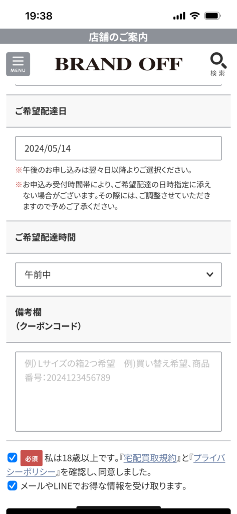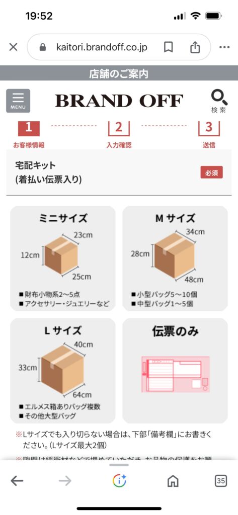 今回は自分で段ボールを用意したので、「伝票のみ」選びました。段ボールない方でも無料でブランドオフが用意してくれます。