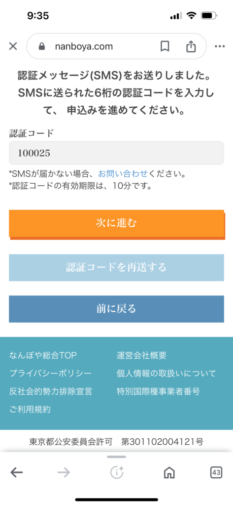 最初に携帯番号を入力し、認証用の番号が送られ入力しましょう。