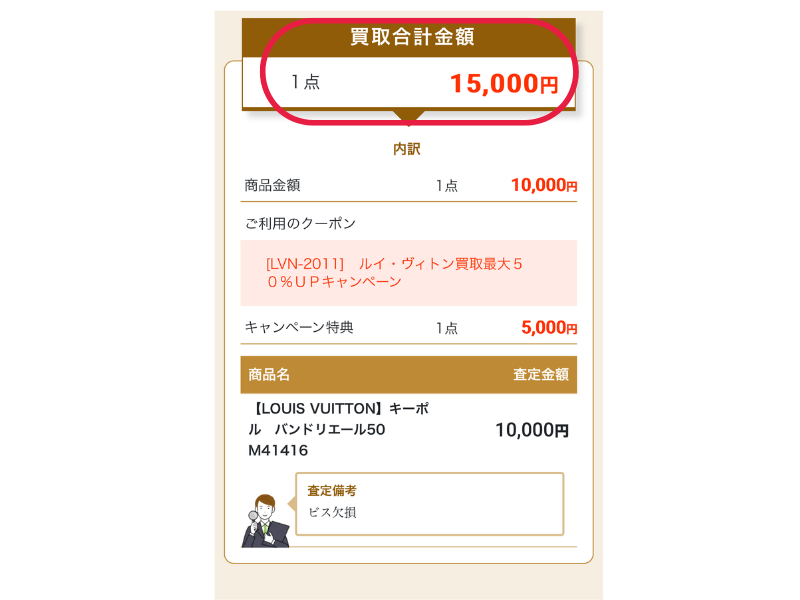 買取金額10,000円で、50%のクーポンで「計15,000円」の買取結果になりました。