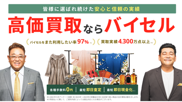 バイセルは着物や古銭、金券、ブランド品を相場より高めに買ってくれるお店です。私も着物とルイ・ヴィトンのバッグ、貴金属、時計を査定してもらい、どれも高値で満足し、値段も納得できました。対応も丁寧で出張買取もあり便利です。信頼できるので、着物を売るならバイセルをおすすめします。