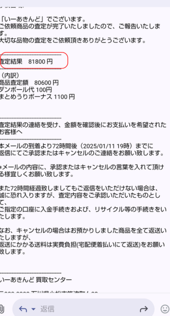 一つ一つの詳細が出ないのが残念ですが、相場80,000円を品物を81,800円つけてくれました。さらに「まとめ売りボーナス」1,100円を上乗せされて良かったです!