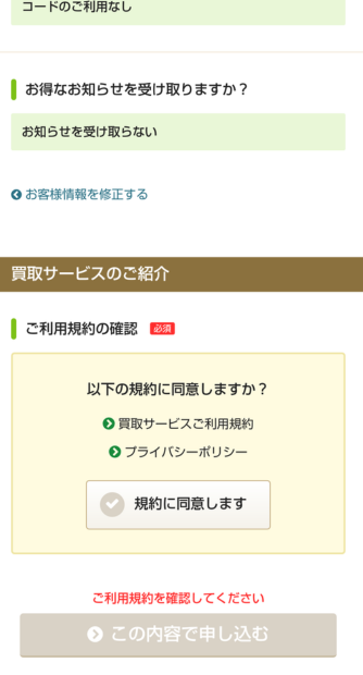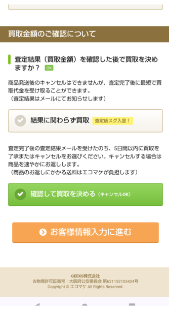 次は承認方法です。私は今回見積もりだけなので「確認して買取を決める」を選択しました。