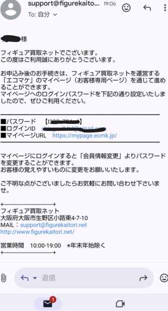 登録が終わると、メールに仮パスワードが送られてきます。仮パスワード使って、マイページにログインしましょう。
