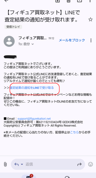 最後にもう一度メールを確認しましょう。LINEの登録をすると、LINEで査定結果が受けられます!