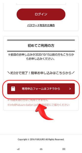 まずは「宅配買取を申し込む」をタップし「専用申込フォームはコチラ」をタップして申し込みをしましょう。