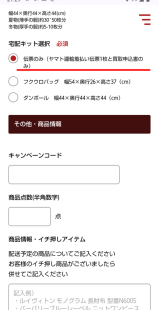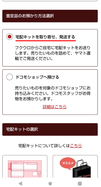 ドコモショップと提携しているようですが、集荷を希望したい方は「宅配キットを取り寄せる」を選択しましょう。また自分で段ボール用意する場合は「伝票のみ」選択しましょう。私は今回「伝票のみ」を選びました。