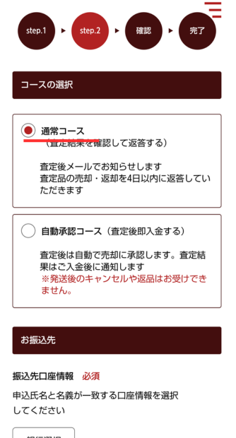 Step2に進むと、「通常コース」「自動承認コース」の選択できます。※「自動承認コース」はおすすめしません。どんなに低い金額になってもご成約が自動で決定し、いかなる場合でもキャンセルできません。安く買い叩かれる可能性もあります。「通常コース」を選びましょう