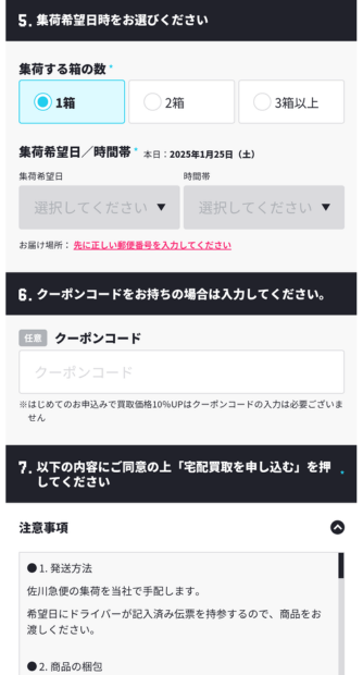 集荷日を設定しましょう!同意したら終わりです。簡単ですね。また送り状は不要です!集荷の時、配送業者さんが持ってきてくれます。