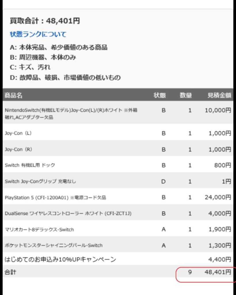 +10%UPキャンペーンが適用されて最終合計48401円になりました。相場を知っている私からすれば、相場並みの妥当な買取金額と言えます。