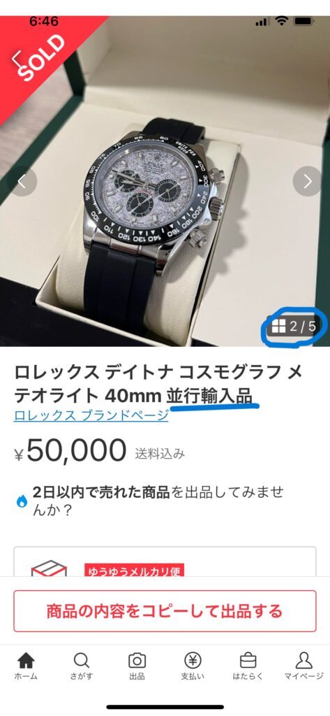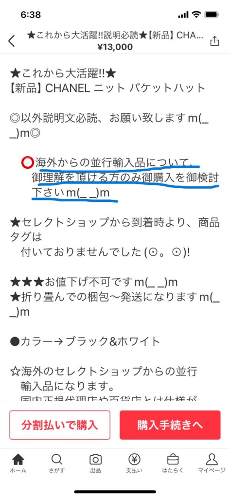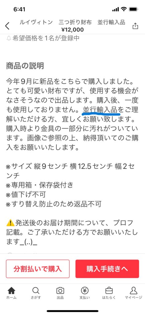 並行輸入品はすべて偽物というわけではありませんが、偽物に多いのは並行輸入品です。その後に「ご理解頂ける方のみ」と記載されているのは偽物だと思って良いでしょう。
