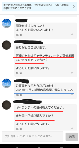 下記のコメントやりとりは、正規品かどうか調べるために相手にギャランティカードの画像を要求しました。