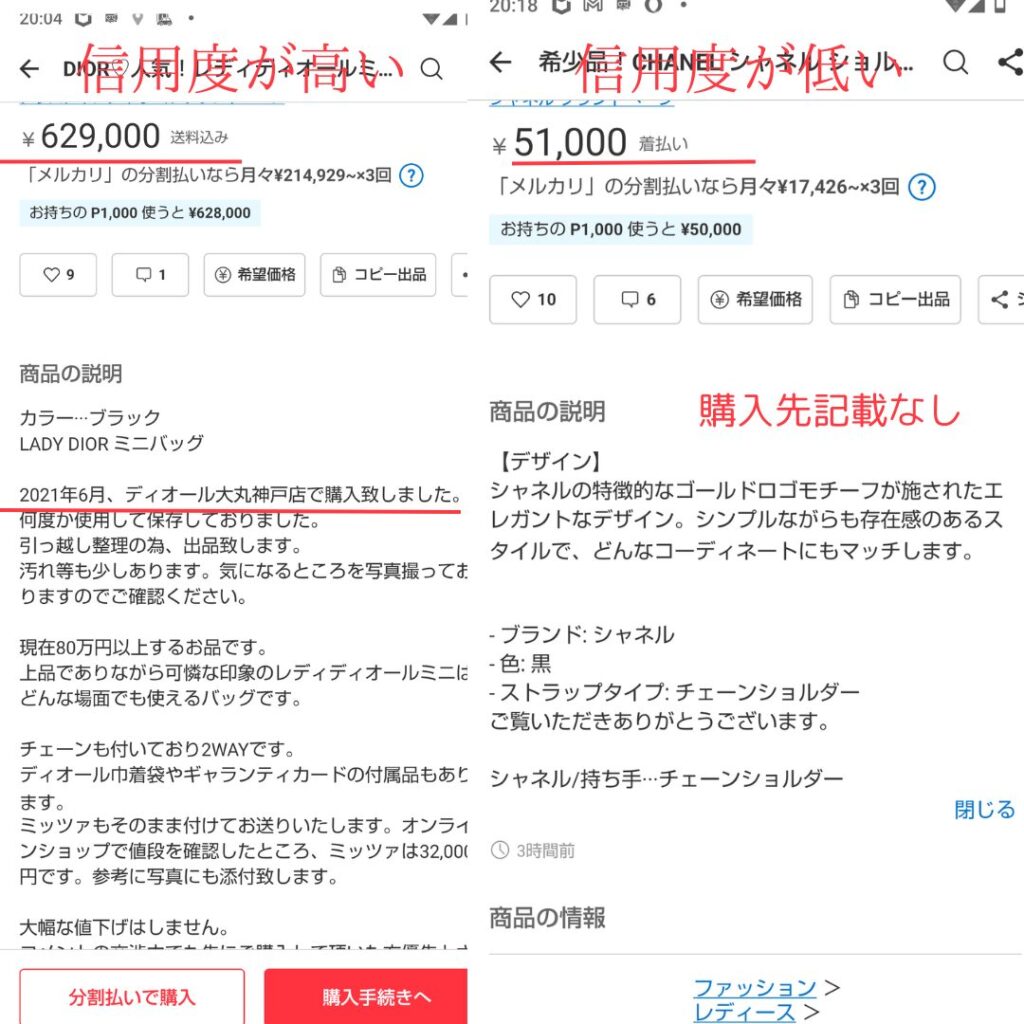 購入先が書いてない方は疑いましょう。購入先が書いてなく高級ブランドを扱っている方は8割は偽物です。