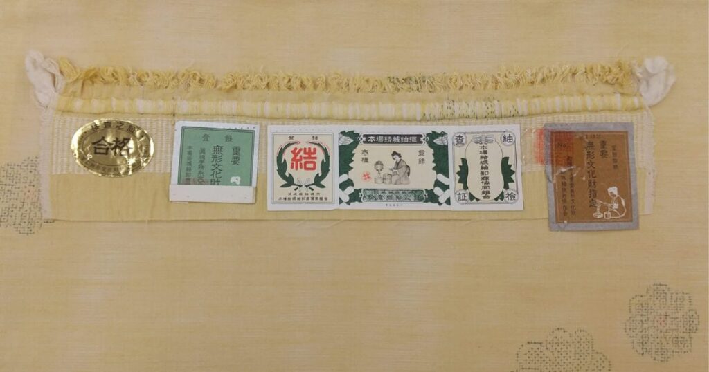 上段の「結マーク」は本場結城紬卸商協同組合が発行するものです。