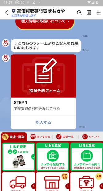 上記の画像をタップし「LINE査定」をクリックし申し込みができます。