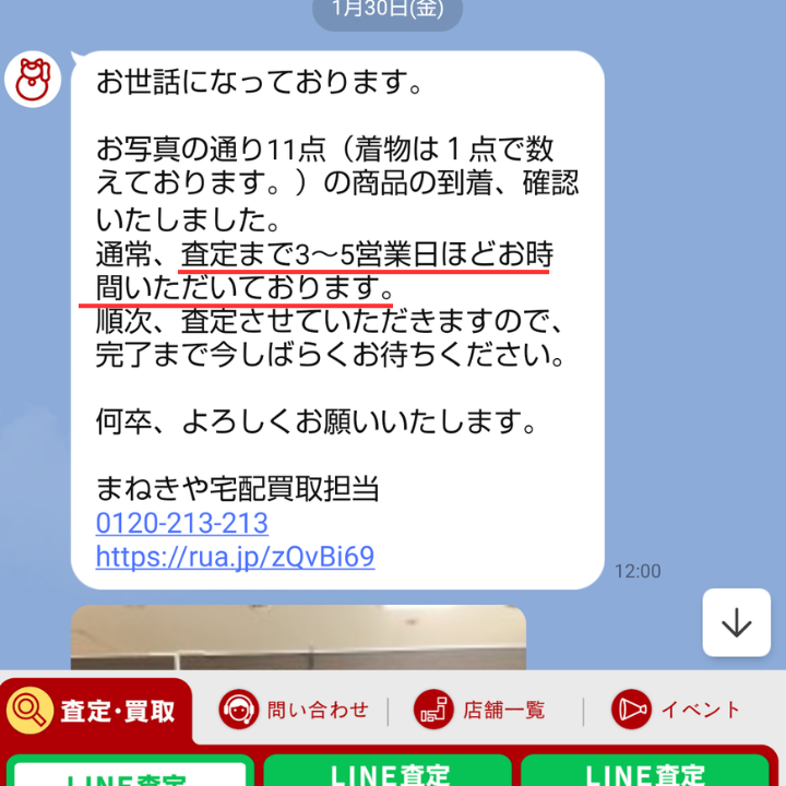 2日後まねきや担当者から「商品が到着しました。3日~5日営業日にご連絡いたします」というLINEの返答がありました。