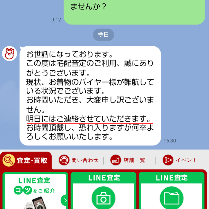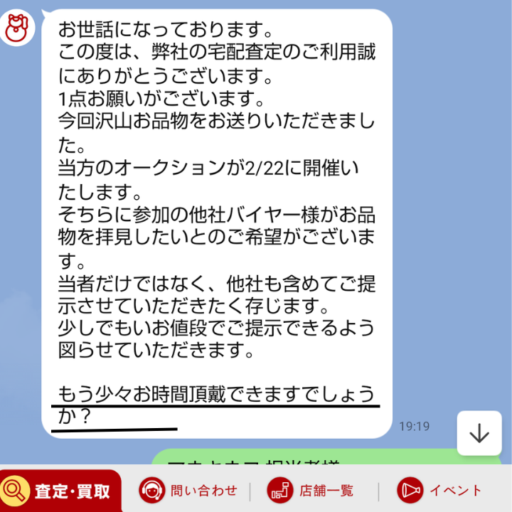 しかし、次の日は連絡来ず。。それから2日後まねきやから下記のLINEが返ってきました。「もうちょっと査定に時間がほしい」とお願いされました。