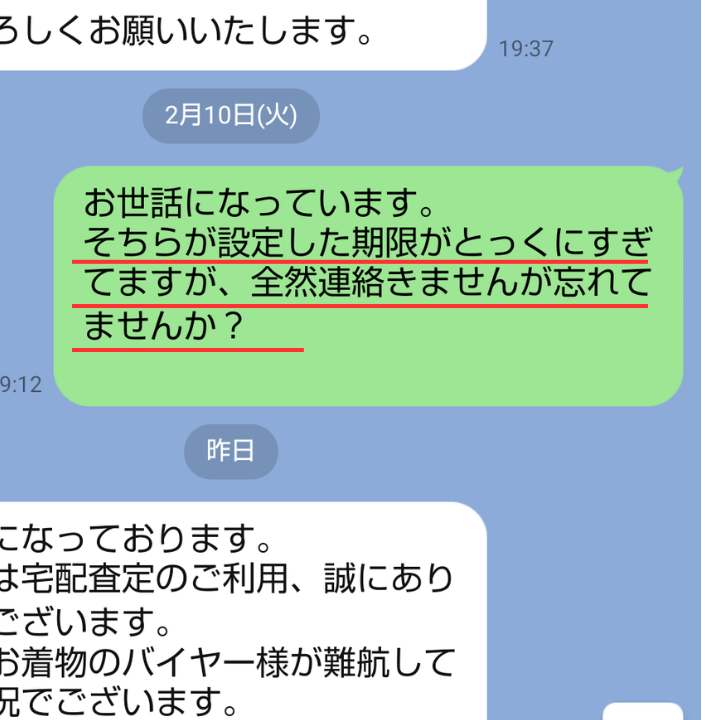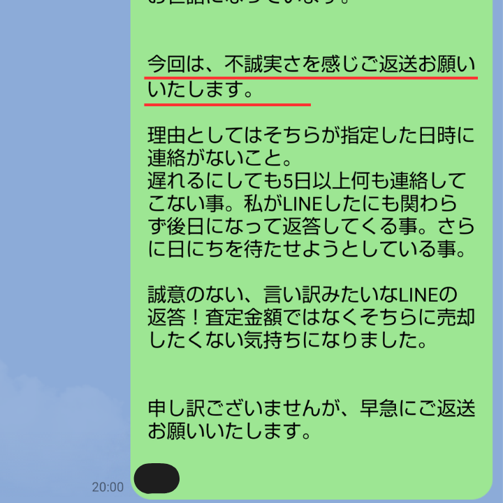この時すでに荷物を送って、13日経っています。なのにまだ時間をくださいとの事。さすがに不誠実さを感じました。私は下記のLINEを送り、返送してもらいました。
