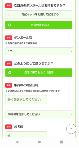 ・段ボールの有無と集荷日の設定