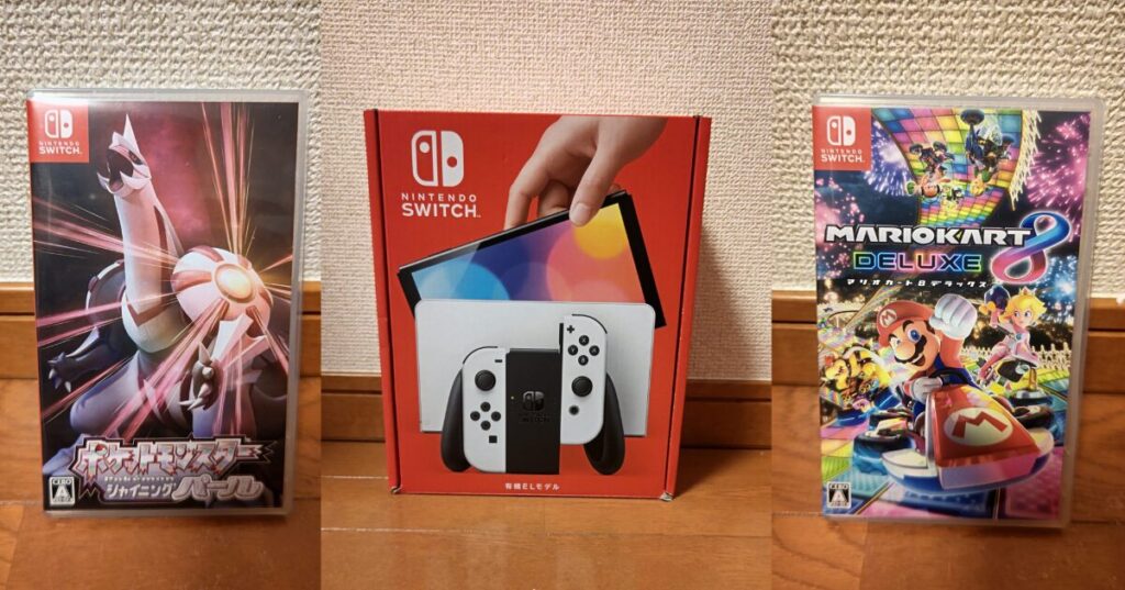 実際に下記の写真、switch有機モデルとswitchのゲームソフト2本を各業者に査定に出してみました。査定額が高い順にしています。