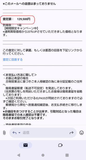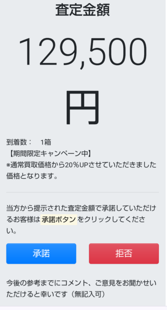 トータル129,500円になりました!買取相場を調べた所、8万円超えると相場より高いという事になります。