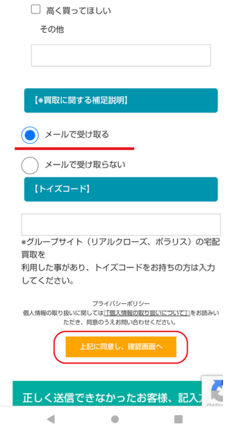 次は個人情報を入力し、査定結果は電話かメールで受け取るか選択します。今回私はメールで受け取るを選択しました。最後に同意をして確認して入力は以上です。